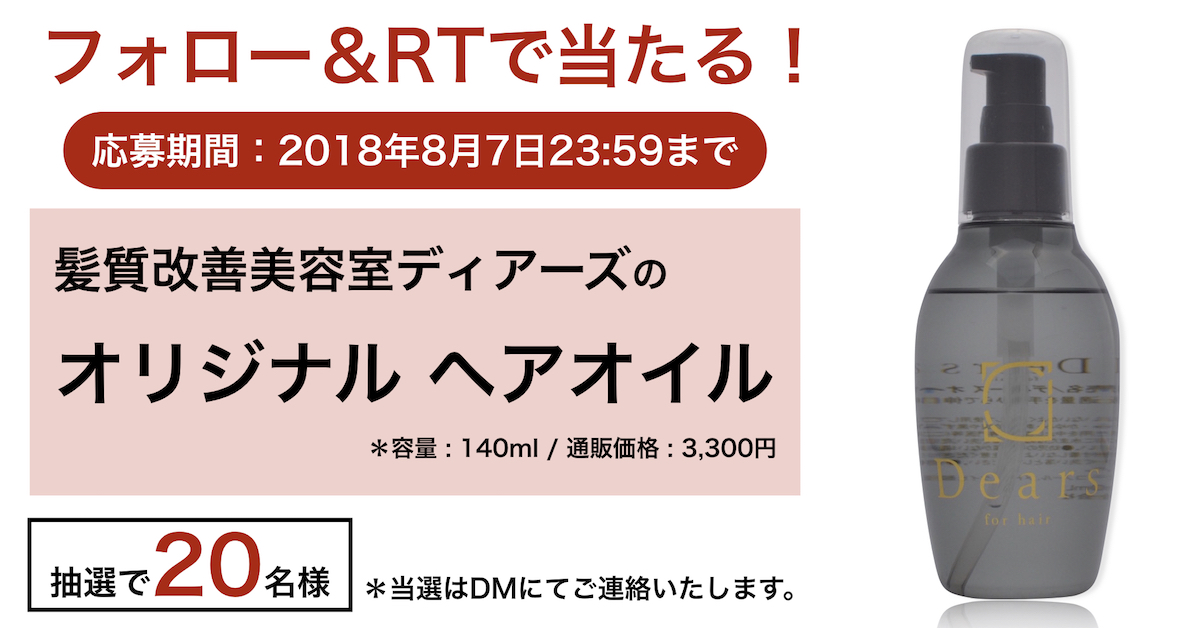ディアーズの公式ツイッター(@dearssalon)のフォロー&リツイートで、ディアーズのオリジナルヘアオイルを抽選で20名様にプレゼント!