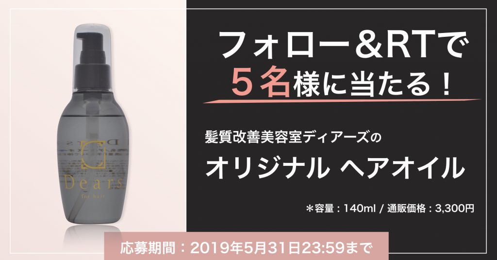ディアーズの公式ツイッター(@dearssalon)のフォロー&リツイートで、ディアーズのオリジナルヘアオイルを抽選で5名様にプレゼント!