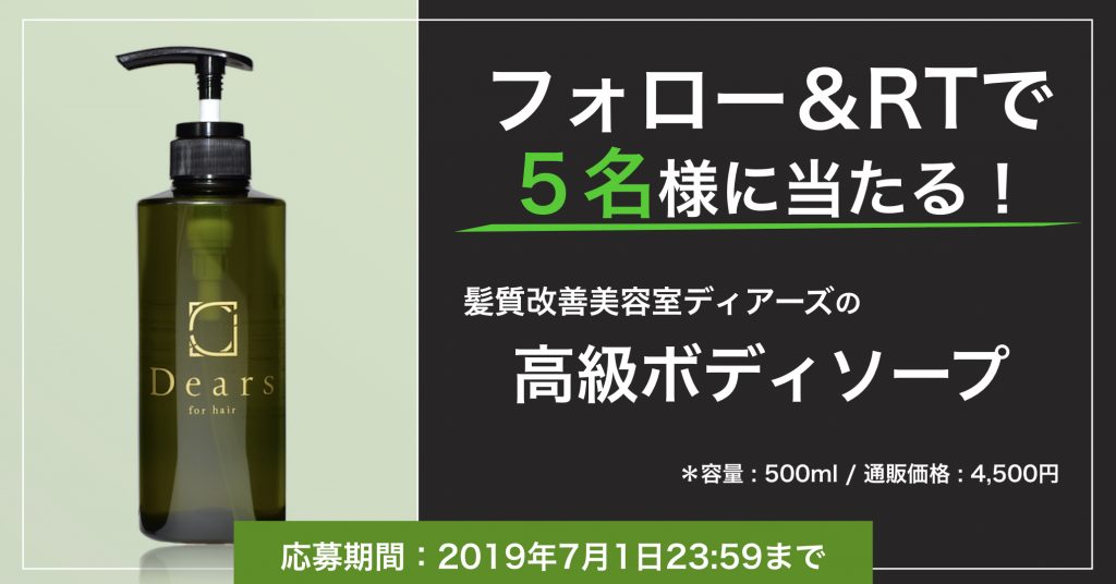 ディアーズの公式ツイッター(@dearssalon)のフォロー&リツイートで、「ディアーズのオリジナルボディソープ」を抽選で5名様にプレゼント!