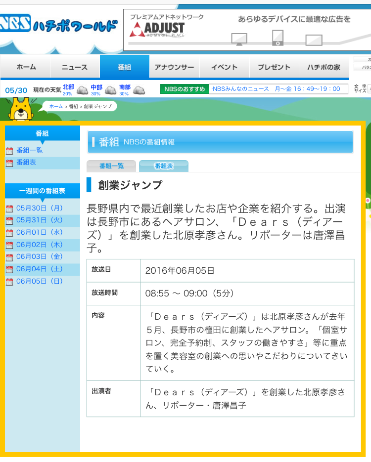 - 内容 「Dears(ディアーズ)」は北原孝彦さんが去年5月、長野市檀田に創業したヘアサロン。「個室サロン、完全予約制、スタッフの働きやすさ」等に重点を置く美容室の操業への思いやこだわりについてきいていく。